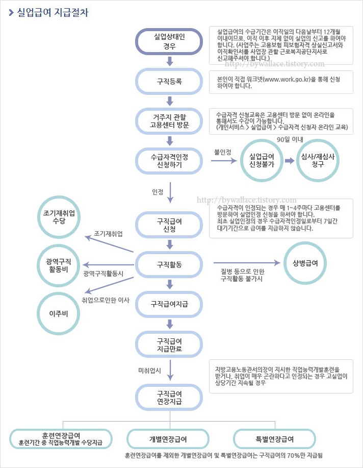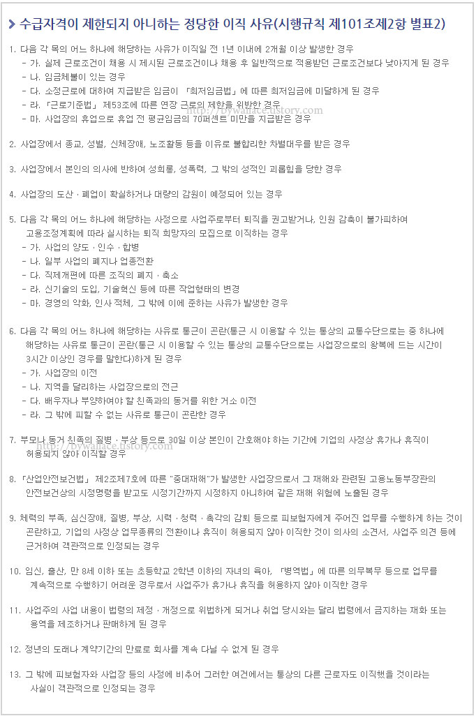 ※ 구직급여는 실업의 의미를 충족하는 비자발적 이직자에게 수급자격을 인정하는 것이지만, 자발적 이직자의 경우에도 이직하기 전에 이직회피노력을 다하였으나 사업주측의 사정으로 더 이상 근로하는 것이 곤란하여 이직한 경우 이직의 불가피성을 인정하여 고용보험 실업급여 신청자격 및 수급자격을 부여한다고 해요.