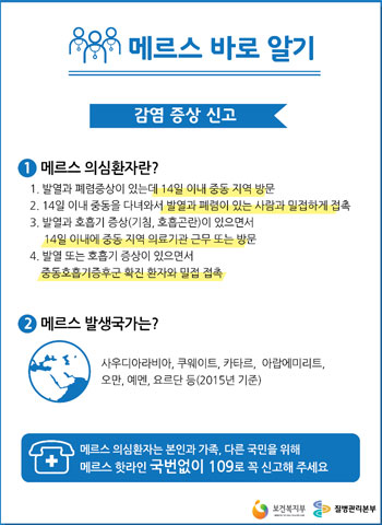 때문에 메르스 여부를 확인하기 위해서는 보건당국에 신고해 검사를 받아야 한다고 해요. 메르스는 감염된 후 2~14일의 잠복기를 거쳐 나타나는데요. 섭씨 38도 이상의 고열, 기침, 숨가쁨, 호흡 곤란 등이 주요 증상이며 또 설사, 변비 등의 소화기 증상을 보이는 경우도 있구요. 만성질환 또는 면역저하자의 경우 폐렴, 급성 신부전 등의 합병증이 동반되기도 한다고 해요.