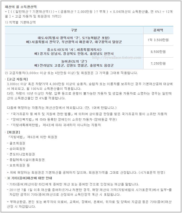3,000cc 이상 또는 4천만원 이상의 고급장동차 및 회원권은 그 가액을 그대로 적용하게 되는데요. 3,000cc 이상 혹은 차량가액 4,000만원 이상의 승용차, 승합차 또는 이륜차를 보유하고 있다면 기본재산공제 대상에서 제외되고, 월 100%의 소득환산율이 적용된다고 해요.