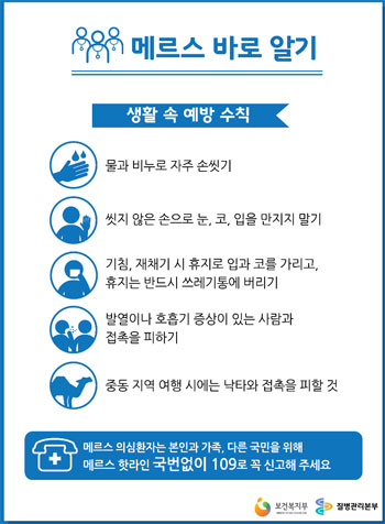 질병관리본부에서 밝힌 메르스 예방법으로는 먼저 평상시 손 씻기 등 개인위생 수칙을 준수할 것, 기침 재채기를 할 경우에는 화장지나 손수건으로 입과 코를 가릴 것, 손으로 눈, 코, 입 만지기를 피할 것, 호흡기 증상이 있는 경우에는 마스크를 쓰고 즉시 의료기관에서 진료 받을 것, 사람이 많이 붐비는 장소 방문은 가급적 자제할 것, 중동지역 여행(체류) 중 낙타, 박쥐, 염소 등 동물과의 접촉을 삼갈 것 등을 당부했다고 해요.
