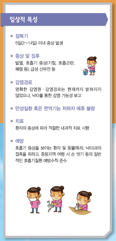 중동호흡기증후군(메르스)은 코로나 바이러스 감염에 의한 중증급성호흡기 질환인데요. 메르스 증상은 감기와 비슷해 증상만으로는 메르스라고 단정하기 어렵다고 해요. 때문에 메르스 여부를 확인하기 위해서는 보건당국에 신고해 검사를 받아야 하죠. 메르스는 감염된 후 2~14일의 잠복기를 거쳐 나타나며 섭씨 38도 이상의 고열, 기침, 숨가쁨, 호흡 곤란 등이 주요 증상이며 또 설사, 변비 등의 소화기 증상을 보이는 경우도 있구요. 만성질환 또는 면역저하자의 경우 폐렴, 급성 신부전 등의 합병증이 동반되기도 한다고 해요.