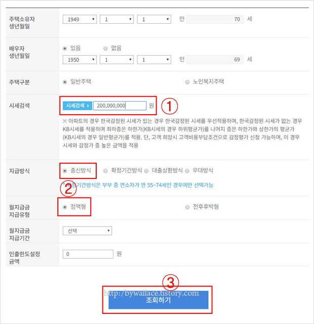 시세 2억의 일반주택을 종신방식, 정액형을 선택한 후