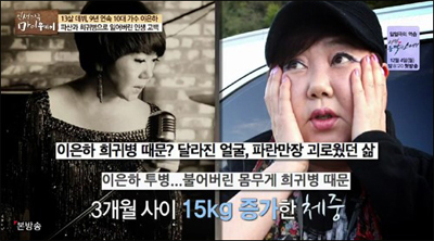 이은하는 척추분리증을 앓던 중 진통제 부작용으로 3개월 만에 15㎏이나 몸무게가 늘어났는데요. 뒤틀린 허리는 온몸에 고통을 줬고 치료 과정에서 쿠싱증후군까지 찾아왔다고 합니다. 특히 치료 대신 일에 몰두하면서 상태는 돌이킬 수 없을 만큼 나빠졌는데요. 아버지의 사채빚 50억 원을 떠안게 되면서 경제 사정이 심각해져 쉴수가 없기 때문이였다고 해요.
