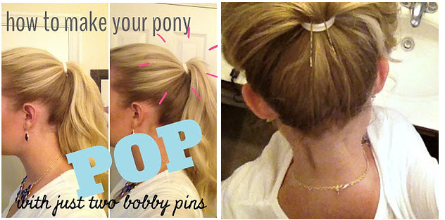 두 개의 실 핀을 포니테일 밑 부분에 고정 시키면 조금더 위로 솟아 발랄한 느낌을 추가시킨다.
