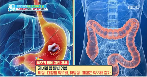 가족력이 있는 경우 위험도가 약 2배로 증가합니다. 위암 원인이 유전요인보다는 가족의 생활환경 특히 식생활 내용이 비슷하기 때문이라고 해석되고 있습니다.