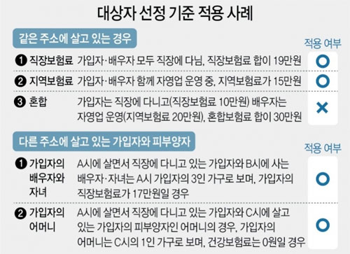 긴급재난지원금 지급 대상 가구 기준도 보다 다양한 가구 형태를 고려해 보완합니다. 앞서 발표처럼 '올해 3월29일 기준 주민등록법에 따른 세대별 주민등록표에 함께 등재된 사람'을 동일 가구로 보되 주소지가 다른 경우 피부양자인 부모(직계존속)와 다른 도시에 거주하는 맞벌이 가구는 다른 가구로 보기로 했습니다. 맞벌이 부부의 경우 합산 보험료가 유리한 경우 동일 가구로 인정할 수 있습니다. 또한 피부양자인 배우자와 자녀는 현실적으로 생계를 같이 하는 관계로 간주해 동일 가구로 봅니다.