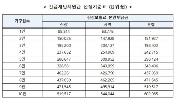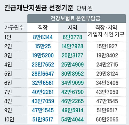 긴급재난지원금 선정기준선은 직장가입자 및 피부양자로 구성된 가구, 지역가입자로만 구성된 가구, 직장·지역가입자가 모두 있는 혼합 가구를 구분해 마련했습니다. 직장가입자 가구의 경우 본인부담 건강보험료가 1인 가구는 8만8천334원, 2인 15만25원, 3인 19만5천200원, 4인 23만7천652원 이하면 지원 대상이 됩니다. 4인 기준으로 지역가입자 가구는 25만4천909원, 혼합가구는 24만2천715원 이하여야 지원대상이 됩니다.