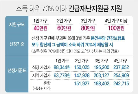 건강보험료는 가장 최신 자료를 활용해 대상자를 선정할 수 있다는 장점이 있습니다. 또 대부분 국민이 건강보험에 가입돼 있어 국민들도 별도 조사 없이 대상자 여부를 확인할 수 있습니다. 이런 긴급 재난지원금 선정기준에 따라 직장가입자를 기준으로 본인부담 건강보험료가 4인 가구는 23만7천원 이하인 경우 재난지원금을 받을 수 있습니다.