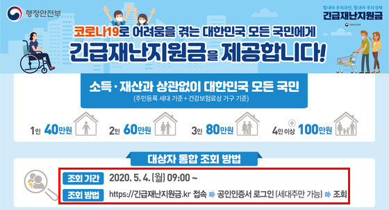 긴급재난지원금.kr 홈페이지 조회 서비스는 5월 4일부터 시작했습니다.