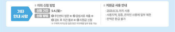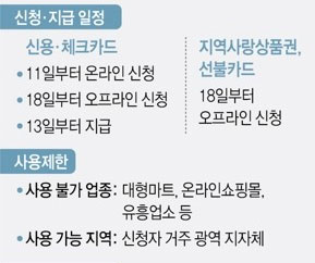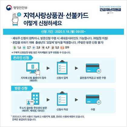 ▣ 지역사랑상품권이나 선불카드로 지급 받기를 원한다면 ▶ 18일부터 지자체에서 마련하는 별도 홈페이지와 주소지 읍, 면, 동 주민센터에서 신청 하면 됩니다. ▶ 신청 시에는 공인인증서와 신분증 등이 필요합니다. ▶ 일부 지방자치단체에서는 모바일 지역사랑상품권도 지급합니다. 다만 신청 일정은 지자체에 따라 달라질 수 있습니다. 이점도 참고하셔야 합니다.