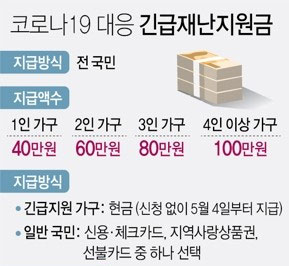 ▣ 긴급재난지원금 지급액 및 금액에 대해 알아보면 ▶가구당 40만 원부터 최대 100만 원까지 전 국민에게 가구별로 지급됩니다. ▶ 1인 가구 40만 원, 2인 가구 60만 원, 3인 가구 80만 원, 4인 이상 가구는 100만 원을 지급받게 됩니다. ▶ 단 이미 지자체로부터 일부 금액을 지원받았으면 지원금이 달라질 수 있습니다.
