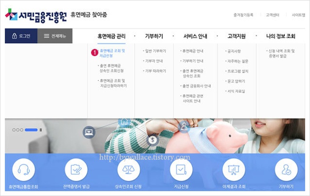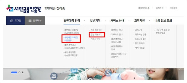 휴면계좌 돈찾기 및 기부 신청 페이지로 이동이 가능하다.