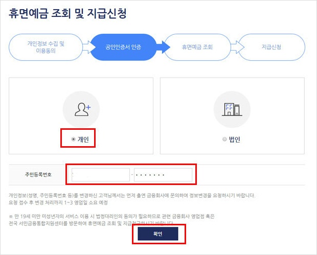 개인과 법인 중 개인을 선택한 다음 확인을 클릭한다.