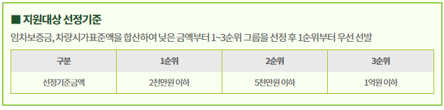 - 선정방법 : 임차보증금, 차량시가표준액을 합산하여 낮은 금액 순으로 선발합니다.