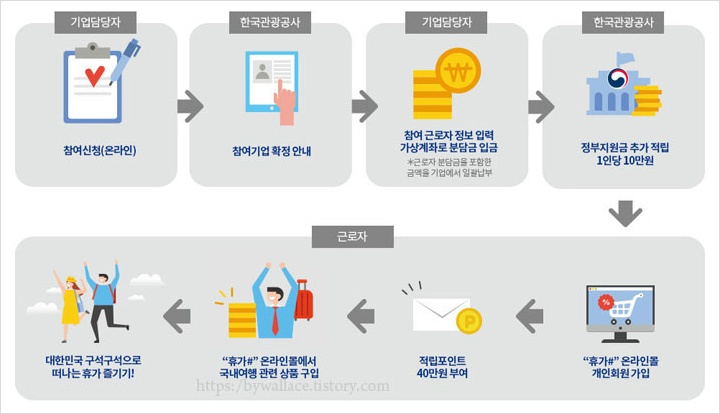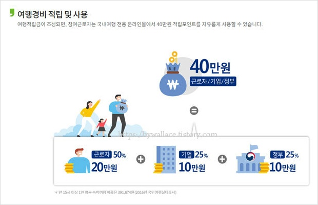 혹 근로자 휴가지원사업이라고 들어보셨나요? 근로자 휴가지원사업이란 직장 내 자유로운 휴가문화 조성과 국내여행 활성화를 위해 도입된 제도인데요. 근로자가 20만원만 부담하며 기업이 10만원 그리고 정부가 10만원을 지원해 총 적립금 40만원을 휴가 때 국내여행 경비로 사용할 수 있도록 하는 제도라고 해요.