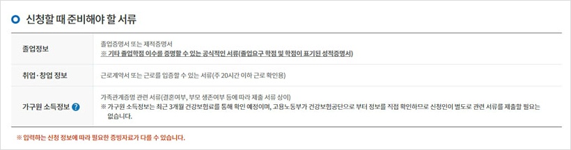 또한 가구원 소득정보 확인을 위해 가족관계증명 관련 서류가 필요할 수도 있다. 결혼여부, 부모 생존여부 등에 따라 제출해야 하는 서류가 다르다. 참고로 가구원 소득정보는 최근 3개월 건강보험료를 통해 확인 예정이다. 고용노동부가 건강보험공단으로 부터 정보를 직접 확인한다. 때문에 신청인이 별도로 관련 서류를 제출할 필요는 없다.