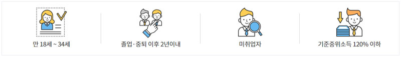 청년 구직활동지원금 자격 및 지원대상을 알아보면 먼저 ①만 18~34세 미취업자여야 한다. ② 고등학교 이하.대학교.대학원을 졸업 또는 중퇴한 지 2년 이내여야 한다. 또한 ③기준중위소득(국민 가구소득의 중간값) 120%(2020년 4인 가구 기준 5,699,009원) 이하 가구에 속하는 청년이여야 한다.
