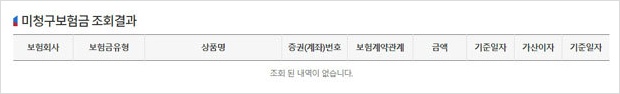 하단 미청구보험금 조회결과는 없는 것으로 나왔다.