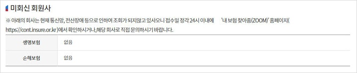 보험조회가 완료되면 보험회사 및 상품명, 증권번호, 보험계약상태, 보험기간