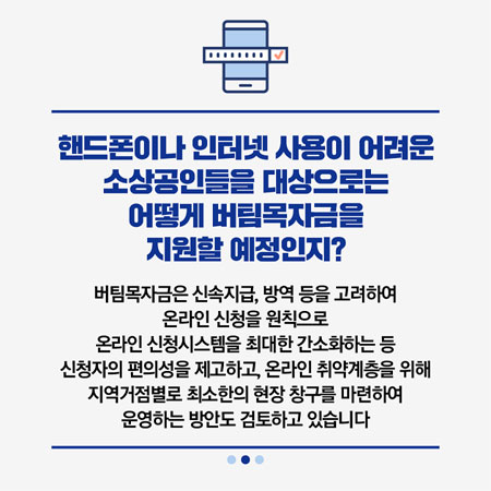 소상공인 3차지원금 신청과 집행은 신속한 지급과 방역 등을 고려하여 원칙적으로 온라인을 통해 진행될 예정이라고 하구요. 온라인 신청방식을 최대한 간소하게 하고 서류제출도 최소화하는 등 휴대폰과 온라인 활용이 익숙하지 않은 소상공인들도 편리하게 지원할 수 있도록 준비하고 있다고 해요.
