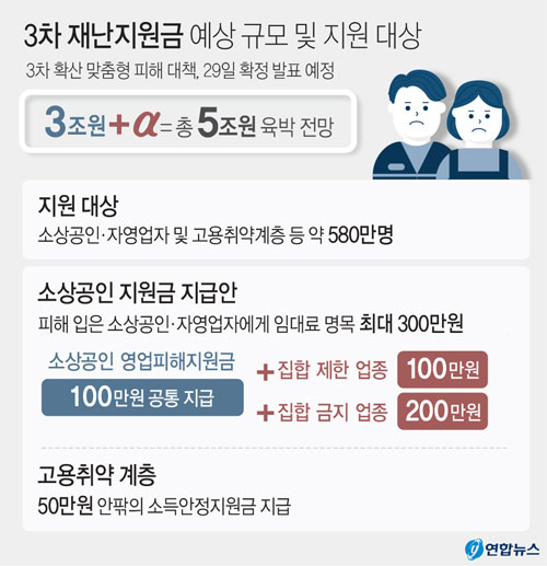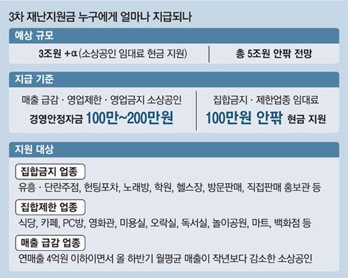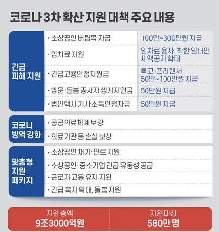 이날 발표되는 소상공인 버팀목 자금은 정부 방역조치로 인해 집합금지 또는 영업이 제한된 소상공인 분들에게 각각 300만원 및 200만 원이 지급되고 매출이 감소한 연매출 4억 원 이하 일반 소상공인에게는 100만 원을 지급하는 내용이 골자라고 해요. 코로나 소상공인 3차재난지원금 총지급액은 약 4조 1000억 원 규모죠.