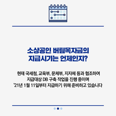 특히 2021년 1월 11일부터 집합 금지 및 영업 제한된 소상공인과 새 희망자금 기수급자에 대해서는 별도 심사 과정 없이 신청만으로 바로 코로나 소상공인 3차지원금을 지급받을 수 있게 할 방침이라고 해요. 이에 대해 중기부는 내년 2월 설 연휴 전 수혜대상자의 90%에게 버팀목 자금 지급을 완료한다는 계획을 갖고 있죠.