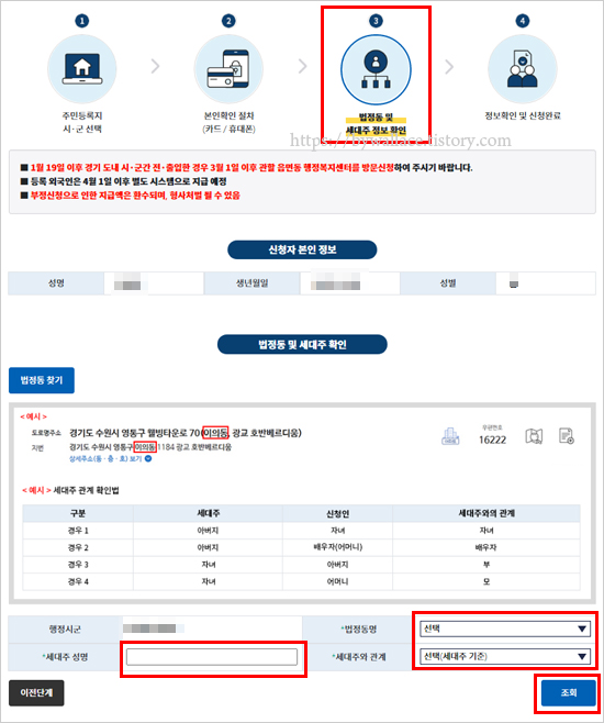 5. 법정동 및 세대주 정보 확인 순서입니다. 신청자 본인 정보를 확인해 줍니다. 법정동 및 세대주 확인 항목에서 법정동명과 세대주 성명, 세대주와의 관계를 입력한 후 조회를 클릭합니다. 이후 세대주 및 세대원, 지급신청금액 및 신청정보를 확인하고 신청 완료를 클릭합니다.