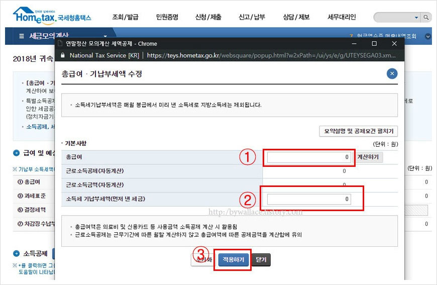1번 항목에는 일 년 동안의 총급여를 입력합니다. 2번 항목에는 지방소득세를 제외한 소득세 기납부세액을 입력합니다. 3번 적용하기를 클릭합니다.