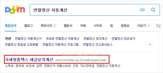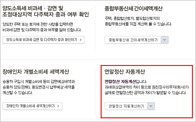 포털사이트 검색창에 연말정산 자동계산을 검색하면 국세청 홈택스 세금 모의계산 홈페이지 바로가기가 나옵니다. 여러 계 산 항목 중에서 연말정산 자동계산 항목을 확인할 수 있습니다. 단 과세대상 급여액의 차이 등으로 인해 실제 연말 정산한 금액과는 차이가 발생할 수 있다고 합니다. 귀속 연도를 선택하면 새창이 열리면서 아래와 같은 항목이 나타납니다.