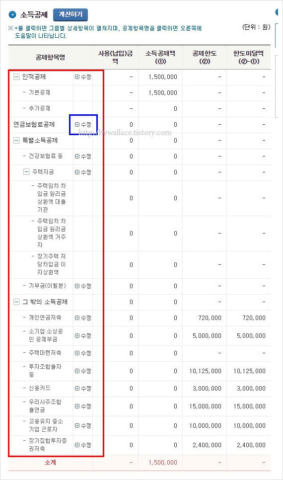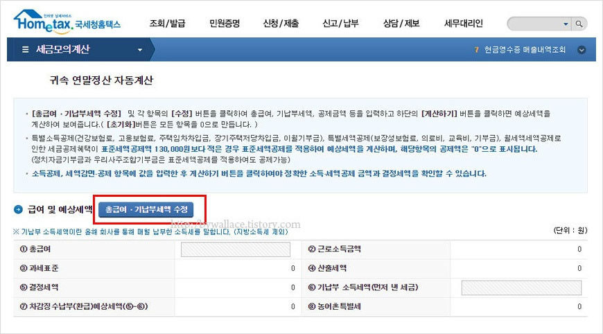 연말정산 간소화 서비스와 비슷한 내용이 나오지만 연말정산 자동계산에서는 모든 것을 직접 입력해야 합니다. 총급여 및 기납부세액 수정 항목을 클릭해서 항목을 채워나갑니다.