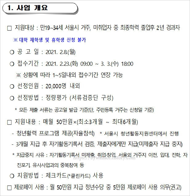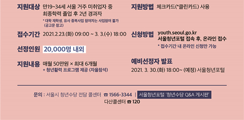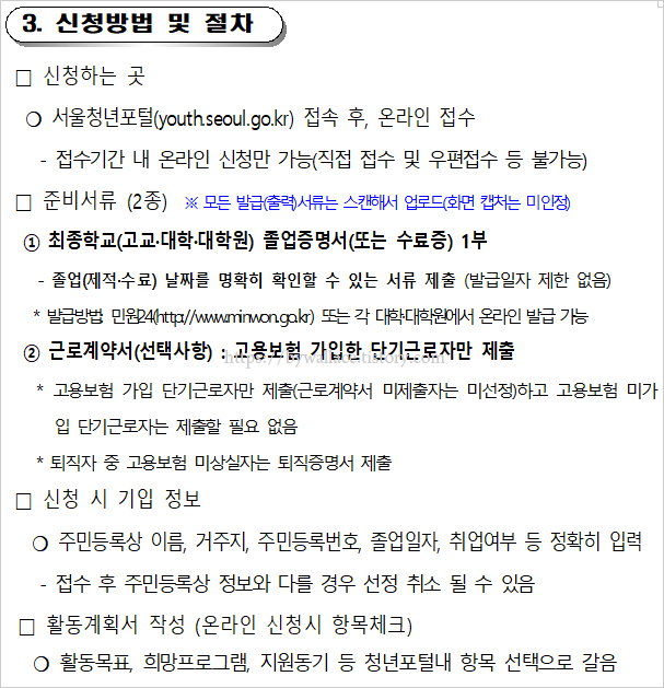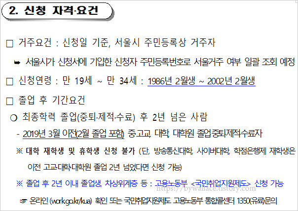 혹 서울 청년수당 자격요건이 안 되는 졸업후 2년 이내 미취업 청년 및 차상위계층(중위소득 50% 이하) 청년 등은 요건 등을 확인하고 고용노동부 '국민취업지원제도'를 활용하는 것도 한 방법이라고 합니다.