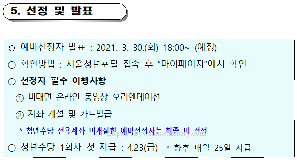 서울시 청년수당 신청 선정 결과는 3월30일 오후 6시 서울청년포털 마이페이지에서 확인할 수 있는데요. 서울시 청년수당 참여자로 최종 선정된 청년은 월 50만원씩 최대 6개월간의 활동지원금을 받는다고 합니다. 선정되면 오리엔테이션을 온라인으로 시청하고 청년수당 지급을 위한 계좌 개설을 꼭 해야 하는데요. 참고로 첫 청년수당은 4월23일 지급할 예정이라고 합니다.