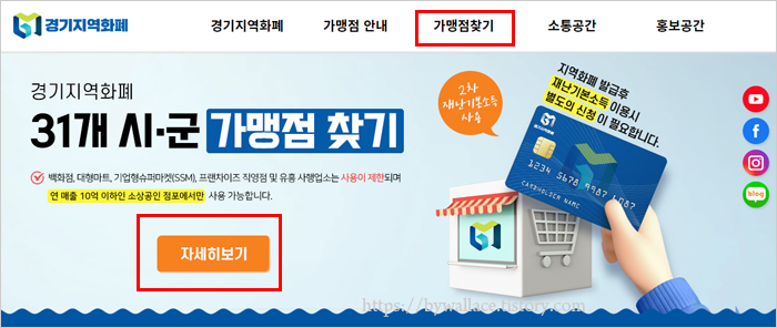 경기지역화폐 가맹점은 경기지역화폐 홈페이지 항목에 있는 가맹점 찾기를 클릭해도 되구요. 홈페이지 배너를 통해 가맹점을 찾을 수도 있어요. 가맹점 찾기나 자세히 보기를 클릭해 주세요.