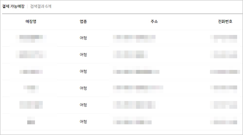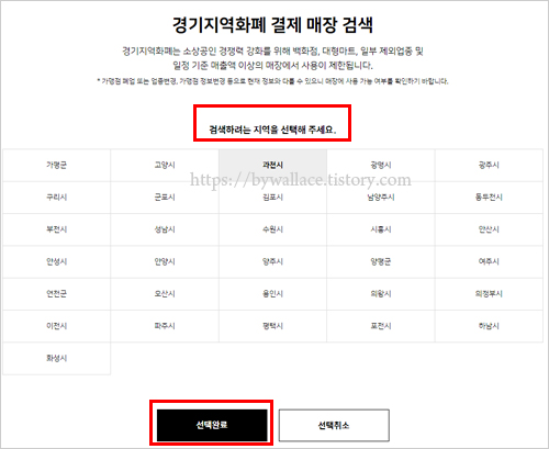 경기지역화폐 결제 매장 검색이 가능한데요. 검색하려는 지역을 선택한 후 하단 선택완료를 클릭해 주세요. 이후 매장명을 직접 입력해 검색하거나 하단 업종을 선택해서도 검색이 가능한데요. 업종을 선택해 검색하면 결제 가능 매장 정보를 모두 확인해 볼 수 있어요.