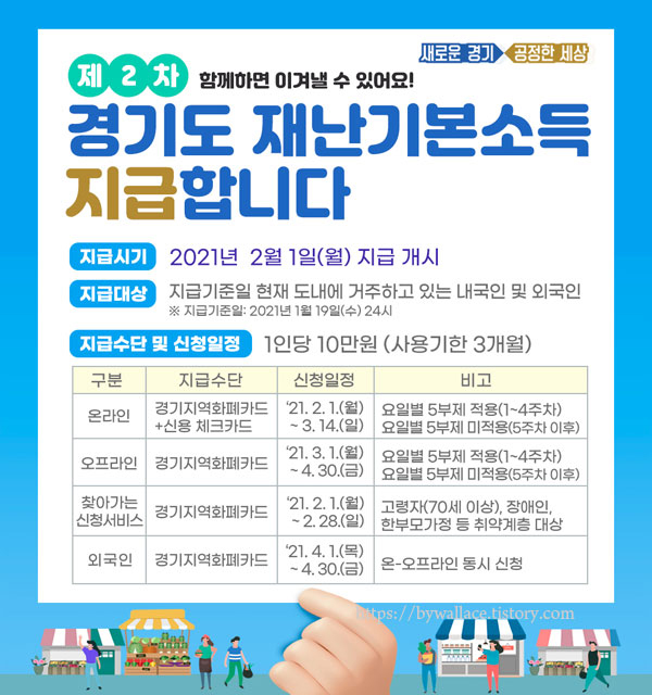 지난 2월1일부터 지원이 시작된 재난 기본소득은 지역화폐로 지급되며 경기도 재난기본소득 사용처는 주민등록 상 주소지 시군의 지역화폐 가맹점에서만 사용이 가능한데요. 경기도 재난기본소득 사용방법은 평소 신용카드나 체크카드를 사용하듯 결제하면 되구요. 지역화폐 가맹점일 경우 자동으로 재난 기본소득에서 차감 처리된다고 해요.