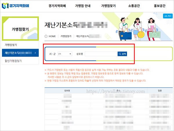 또한 경기지역화폐 홈페이지에서 가맹점 찾기를 클릭하게 되면 현재 접속 중인 경기도 재난기본소득 사용처 가맹점 찾기 지역이 자동으로 뜨게 되는데요. 가맹점 찾기를 클릭하게 되면 지역 가맹점 정보가 한눈에 보여지고요. 이때도 시군을 선택하거나 상호명을 입력해 검색할 수도 있어요.