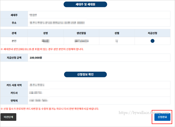 이후법정동 및 세대주 정보 확인 순서에서 신청자 본인 정보 확인 및 법정동명, 세대주 성명, 세대주와의 관계를 입력한 후 조회를 클릭해 주세요. 다음으로 세대주 및 세대원, 지급신청금액 및 신청정보를 확인하고 신청 완료를 클릭해 주세요.
