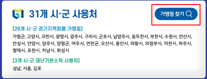 경기 재난기본소득 사용처인 31개 시, 군 사용처 가맹점 찾기가 가능한데요. 단 경기도 재난 기본소득온라인 신청 시 경기지역화폐에 참여하지 않는 3개 시군(김포, 시흥, 성남)은 경기지역화폐로 신청이 불가능하구요. 실물 카드를 사용하지 않는 지역(성남, 시흥, 김포)의 경우 일회성 경기지역화폐카드를 행정복지센터에서 발급받을 수 있다고 해요. 가맹점 찾기를 클릭해볼까요.