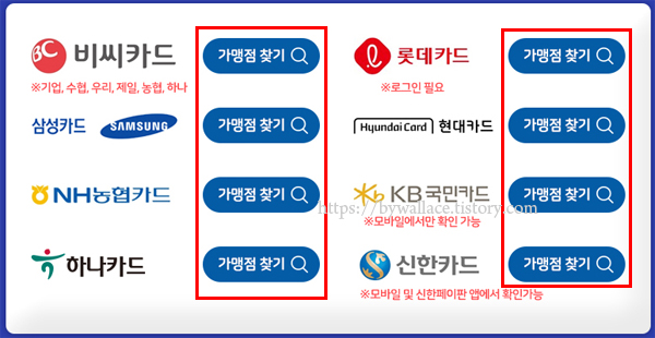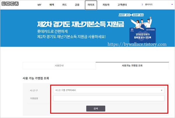 경기도 재난기본소득 사용처는 재난 기본소득에 참여하는 카드사 홈페이지에서도 확인할 수 있는데요. 다만, 카드사별 사용처가 일부 상이할 수 있기 때문에 각 카드사별 재난 기본소득 사용처를 확인 후 사용해야 한다고 해요. 예시로 롯데카드를 선택하면 아래와 같이 카드사별 사용 가능한 가맹점을 조회할 수 있죠.