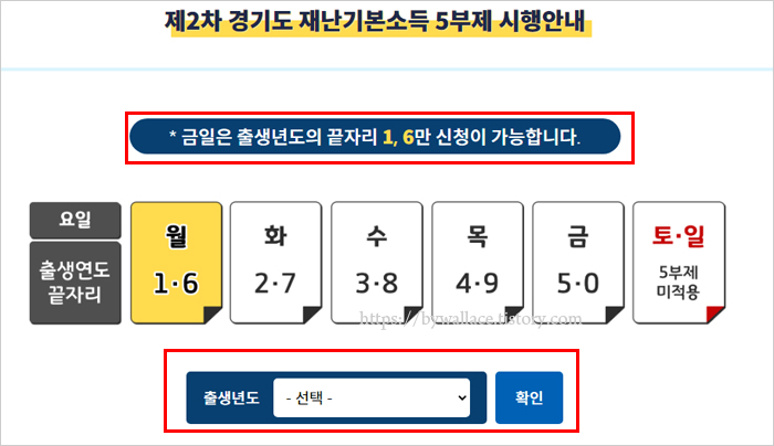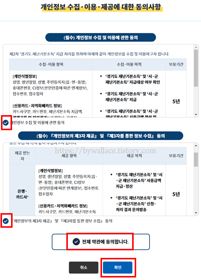 경기도 재난기본소득 신청은 1주에서 4주 차까지는 5부제가 시행되기 때문에 참고해주시구요. 아래 출생년도를 선택한 후 확인을 클릭하면 개인정보 수집 및 이용에 관한 동의사항이 나오는데요. 전체 약관에 동의한 후 확인을 클릭해 주세요.