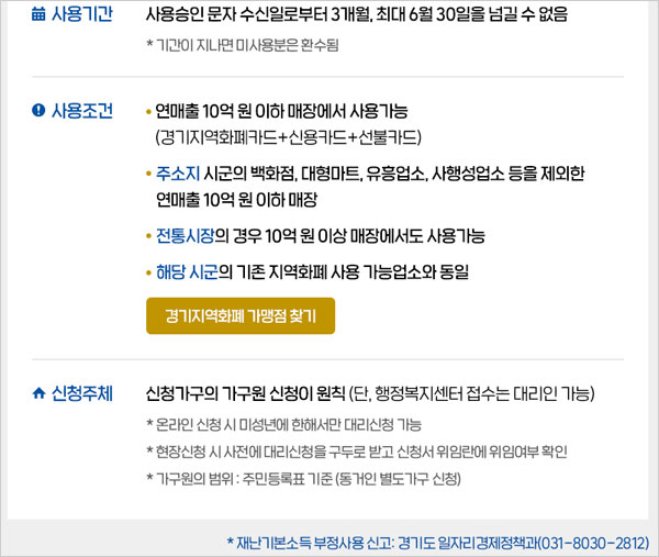 참고로 경기도 재난기본소득 사용기간은 사용 승인 문자 수신 일로부터 3개월이구요. 다만 최대 6월 30일을 넘길 수 없으며 이 기간이 지나면 미사용분은 환수된다고 해요.