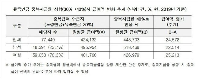 따라서 중복지급률이 10%P 상향 조정되면 전체 중복수급자의 월평균 수급액은 44.8만원으로 월 2만4000원 가량 증가되며 여성의 경우 42.6만원으로 월 2만5000원 가량 수급액이 늘어날 것으로 추계되고 있다고 합니다.