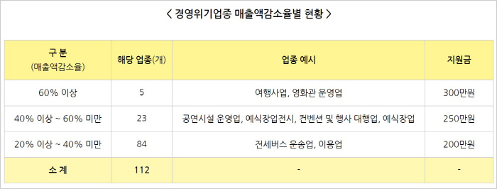 정부는 경영위기업종도 매출 감소 정도에 따라 20%이상~40% 미만 감소 업종은 200만원, 40%~60% 미만 업종은 250만원, 60% 이상 감소 업종 300만원을 차등 지급할 예정입니다.