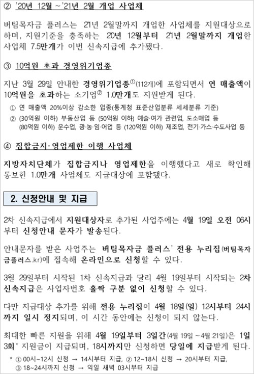 버팀목자금 플러스는 ‘21년 2월말까지 개업한 사업체를 지원대상으로 합니다. 지원기준을 충족하는 ‘20년 12월부터 ‘21년 2월말까지 개업한 사업체 7.5만개가 이번 신속지급에 추가됐다고 합니다.