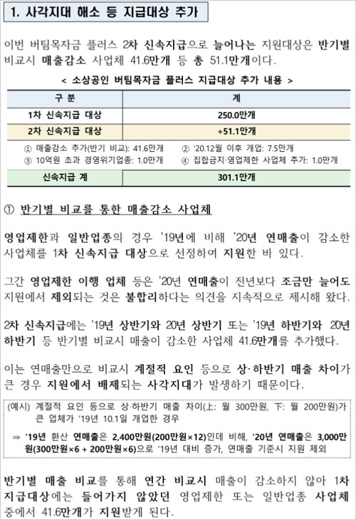 2차 신속지급에는 ’19년 상반기와 20년 상반기 또는 ’19년 하반기와 ‘20년 하반기 등 반기별 비교시 매출이 감소한 사업체 41.6만개를 추가했다고 하는데요. 이는 연매출만으로 비교시 계절적 요인 등으로 상반기 및 하반기 매출 차이가 큰 경우 지원에서 배제되는 사각지대가 발생하기 때문이라고 해요.