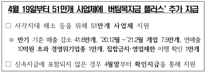 버팀목자금 플러스는 ‘21년 2월말까지 개업한 사업체를 지원대상으로 하며, 지원기준을 충족하는 ‘20년 12월부터 ‘21년 2월말까지 개업한 사업체 7.5만개가 이번 신속지급에 추가됐다고 해요