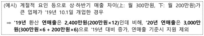 (예시) 계절적 요인 등으로 상‧하반기 매출 차이(上: 월 300만원, 下: 월 200만원)가 큰 업체가 ’19년 10.1일 개업한 경우⇒ ’19년 환산 연매출은 2,400만원(200만원×12)인데 비해, ’20년 연매출은 3,000만원(300만원×6+200만원×6)으로 ’19년 대비 증가, 연매출 기준시 지원 제외.