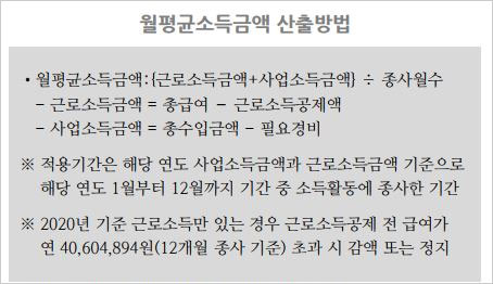 여기서 월평균소득금액이란 소득세법 규정에 따른 본인 근로소득금액, 사업(부동산임대소득 포함) 소득금액을 합산하여 소득이 발생한 해의 종사(근무)월수로 나눈 금액으로 금융소득 등은 포함되지 않는다고 해요.