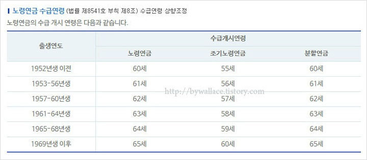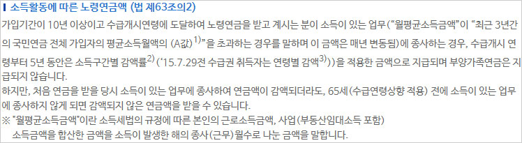 단, 55세(수급연령 상향규정 적용 : 55~60세) 이후에 연금을 신청하여 지급받다가 60세(노령연금 수급개시연령) 전에 소득이 있는 업무에 종사할 경우는 그 소득이 있는 기간 동안 연금지급이 정지되는데요.