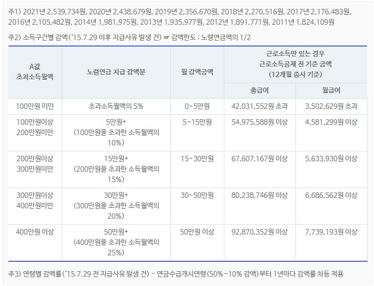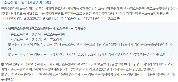 다만 조금이라도 소득이 있다고 무조건 감액되는 것은 아니라고 하는데요. 소득이 있는 업무란 월평균소득금액이 최근 3년간 국민연금 전체 가입자 평균소득월액(2020년 기준 243만8679원)을 초과하는 경우를 말하구요.